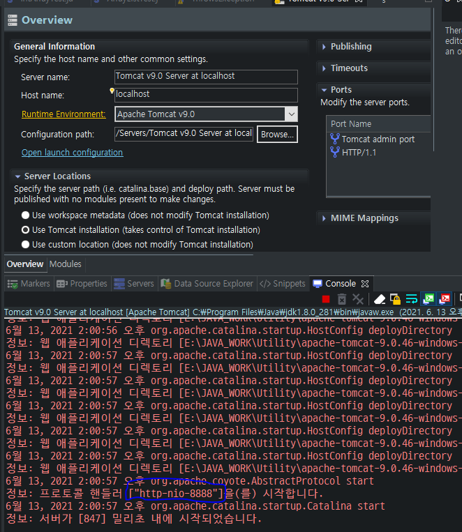 * Tomcat v9.0 Sever at localhost 더블클릭