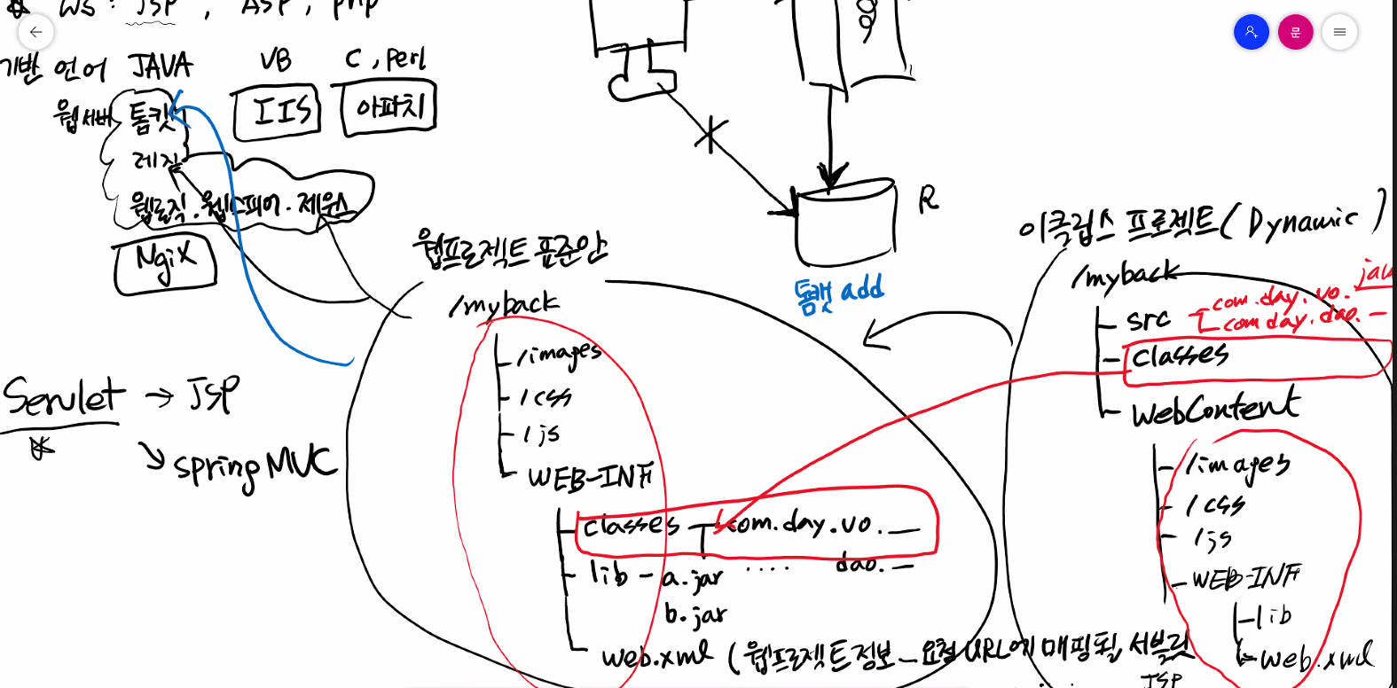 * WEB-INF(classes: 필수 디렉토리) - 같은 위치 경로 lib라이브러리( *.jar파일로 저장)