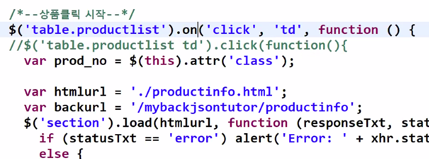 1. $('table.productlist').on('click', 'td', function () { -> ajax요청 후에 DOM트리 생성 이후에도 태그를 찾고 실행함.