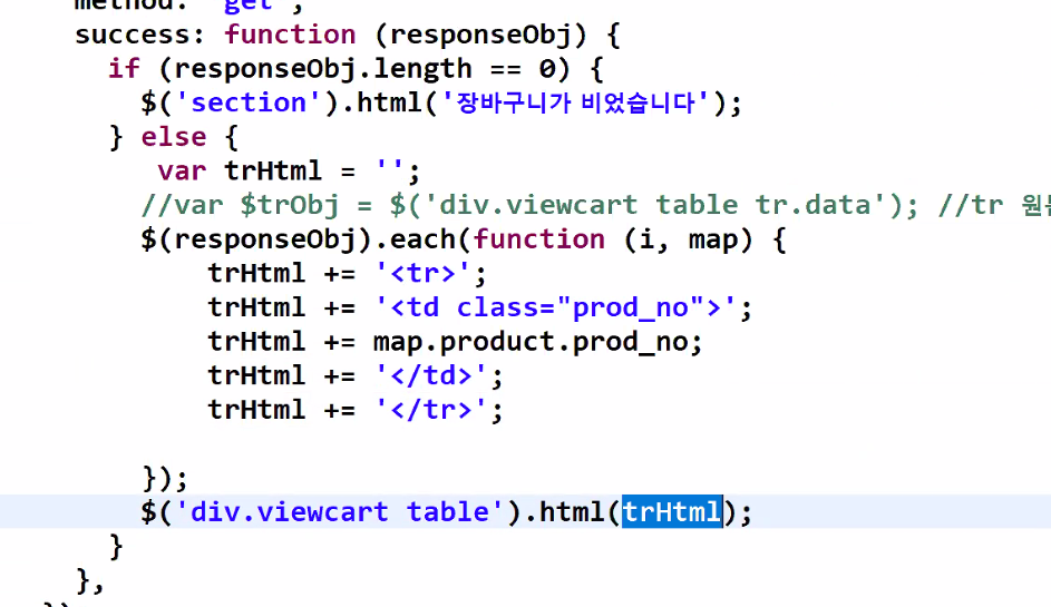 1. $('table.productlist').on('click', 'td', function () { -> ajax요청 후에 DOM트리 생성 이후에도 태그를 찾고 실행함.