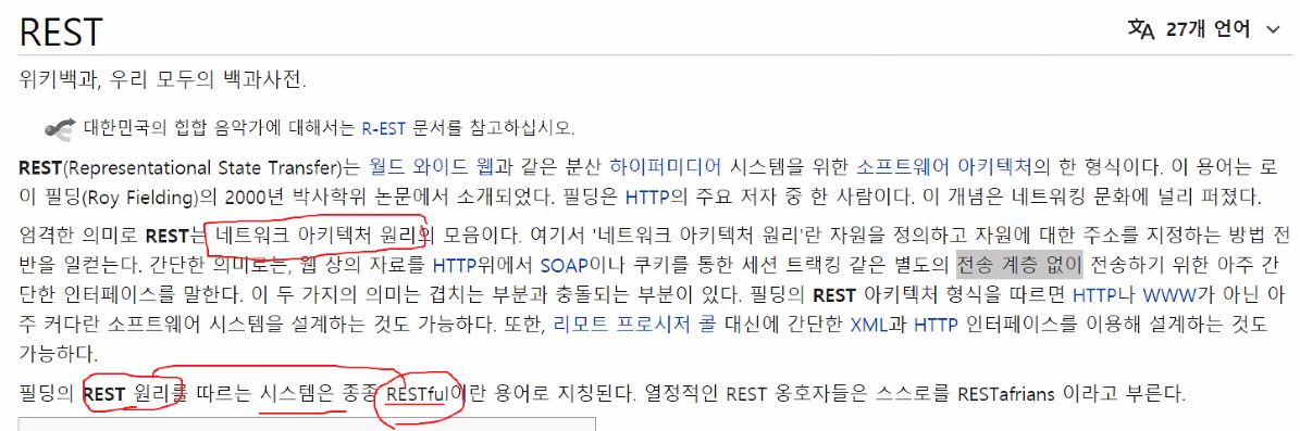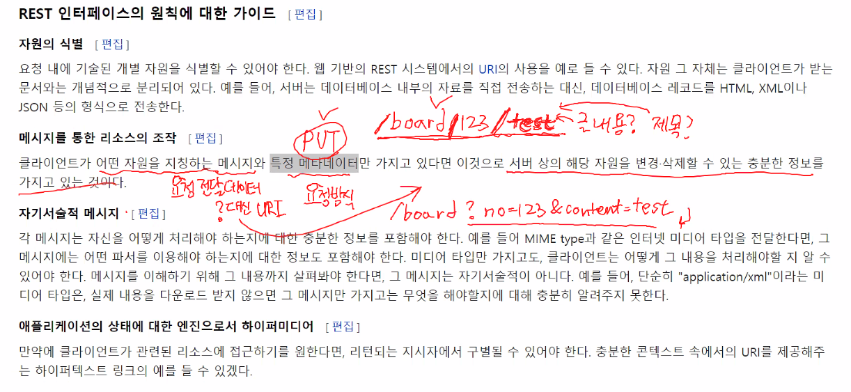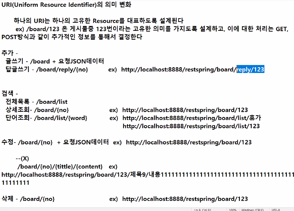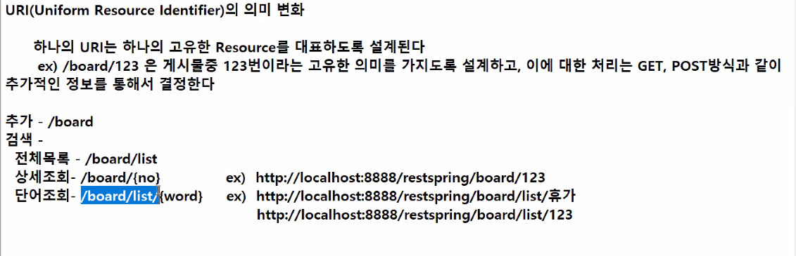 ex) /board/123은 게시물중 123번이라는 고유한 의미를 가지도록 설계하고, 이예 대한 처리는 GET, POST방식과 같이 추가적인 정보를 통해서 결정한다.