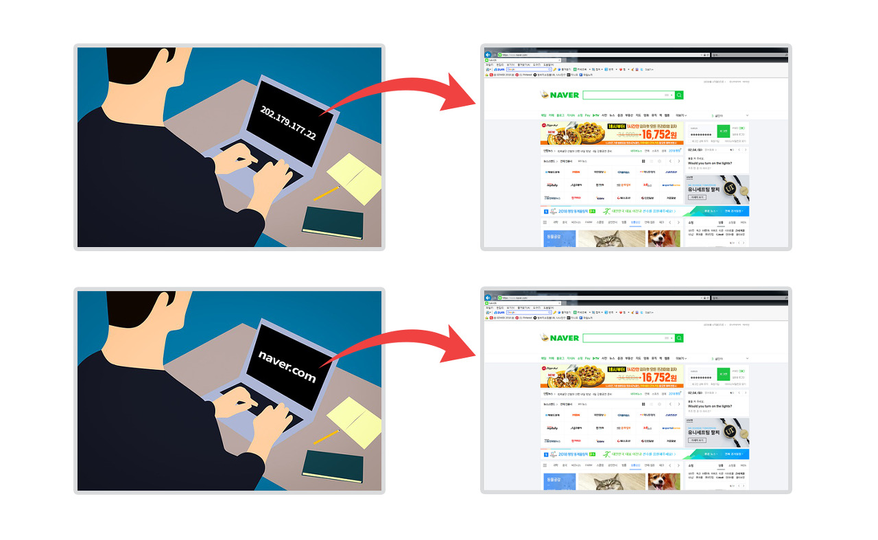 따라서 도메인 네임을 실제 IP 주소로 변경해 주어야만 컴퓨터가 목적지를 제대로 찾아갈 수 있습니다.