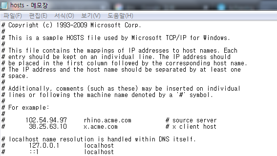 로컬PC의 C:\Windows\System32\drivers\etc 경로(윈도우 설치 경로에 따라 조금 차이가 있을 수 있음)에는 hosts라는 파일이 있다. 이 파일을 메모장으로 열어보면, IP주소와 도메인 주소를 설정할 수가 있다. 이 파일은 PC의 자체 DNS역할을 하며, 브라우저는 가장 먼저 이 파일을 확인하여 입력한 도메인의 매핑정보가 존재하는지 확인한다.