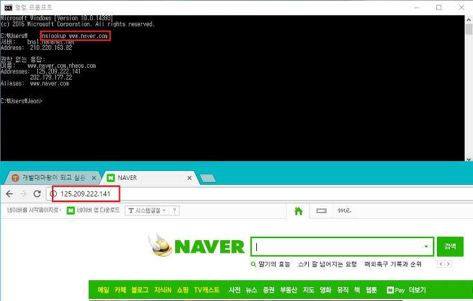 ▶네이버의 IP주소를 직접 입력하여 접속한 모습, nslookup 명령어로 DNS서버에서 IP주소를 찾았다.