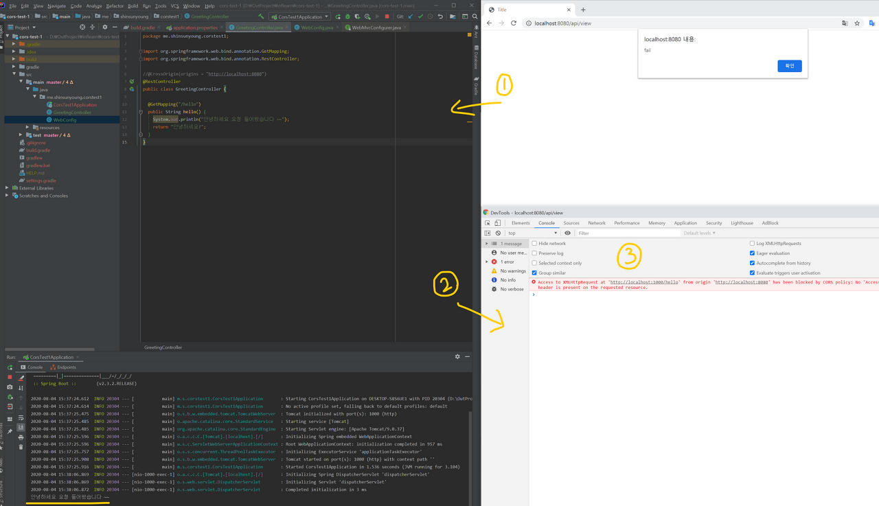 이제 1차적인 구현은 끝났으니 프로젝트 두 개의 서버를 모두 켜주고, localhost:8080/api/view로 접속하면 fail이라는 정보가 담긴 alert창이 뜨며 콘솔에는 CORS 관련 오류가 나타나는 것을 확인할 수 있습니다. (만약 404 오류가 뜬다면 thymeleaf를 의존성에 추가했는지 다시 한 번 확인해주세요!)