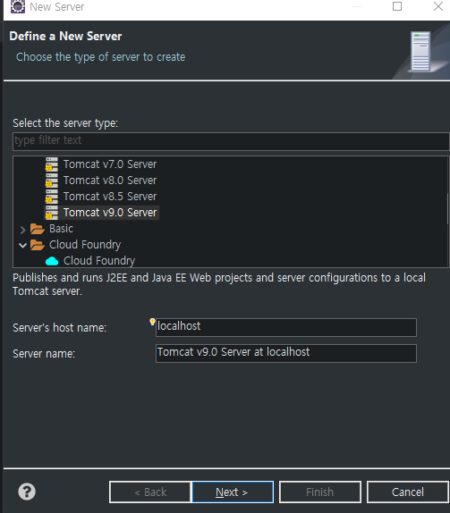 * tomcat v9.0 선택 후 Next버튼 클릭!