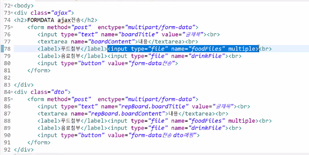 pom.xml commons-fileupload commons-fileupload 1.4 servlet-context.xml 파일 추가 태그의 multiple속성을 설정시 여러개의 파일을 업로드 가능 mutiple속성이 없을경우 1개의 파일만 업로드 $(function(){ $("div.ajax>form>input[type=button]").click(function(){ //form태그의 enctype="multipart/form-data"인 경우 //요청전달데이터와 업로드될 파일데이터들은 모두 FormData객체에 저장되어있다 var formData = new FormData($("div.ajax>form")[0]); console.log(formData); formData.forEach(functi..